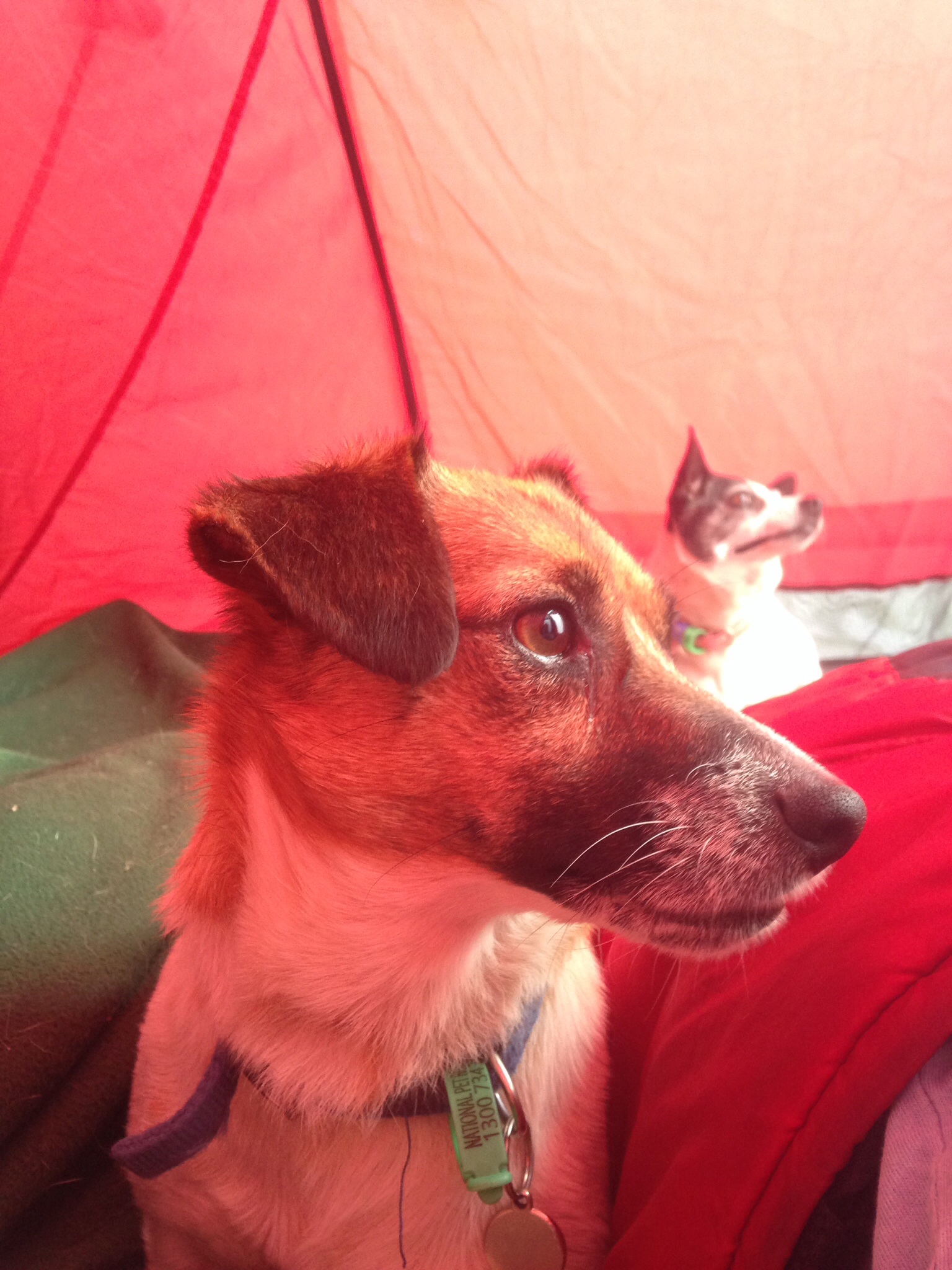 We have recently upgraded to a pop-up tent. The joy of this new technology is the two skins are joined. Making the little annex area at the front doggy friendly. We can get a good nights sleep, the dogs are safely confined within the tent and can happily watch us sleep.